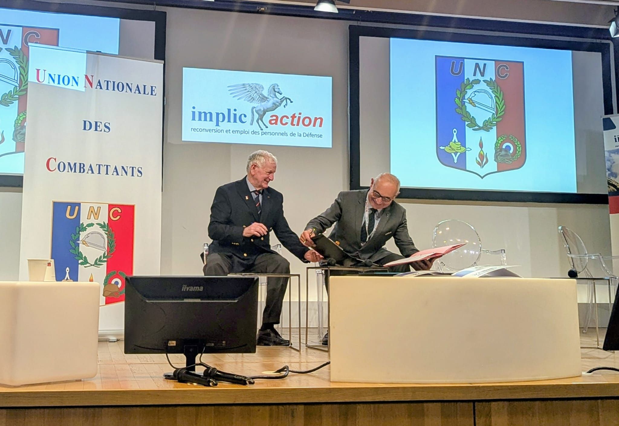 Vendredi 7 février, le général de corps aérien (CR) Hervé Longuet, président de l'Union nationale des combattants, et le général de corps d'armée (2S) Hubert Trégou, président de l'Association Implic'Action, ont renouvelé la convention qui lie les deux associations, à l'occasion de l'événement organisé par Implic'Action dans les locaux du Mouvement des entreprises de France (Medef), en présence d'environ 150 de ses membres, de ses partenaires, comme Unéo ou La France Mutualiste, des chefs d'entreprise et des associations de soutien aux blessés. Partenaires de longue date d'Implic'Action, l'UNC œuvre aussi à aider ceux qui quittent le ministère des Armées à se reconvertir ; c'est un des nombreux services qu'offre notre association, car là aussi, il s'agit de solidarité, au même titre que l'aide aux plus démunis ou aux blessés. Cette signature a été l'occasion pour le président national de l'UNC et Jacques Le Bigot, administrateur national de l'UNC et président du comité recrutement-reconversion, lui-même membre d'Implic'Action, de présenter l'UNC aux nombreux candidats à la reconversion présents à cette occasion. © D.R.