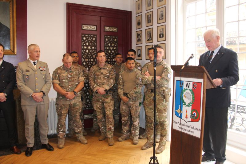 Jeudi 8 janvier, le général de corps aérien (CR) Hervé Longuet, président national, a présenté les voeux de l'UNC, en présence, entre autres, de David Dominé-Cohn, directeur de cabinet adjoint et d'Olivier Maigne, conseiller spécial d'Alice Rufo, ministre déléguée auprès de la ministre des Armées et des Anciens combattants, de la maire du 8e arrondissement de Paris, Jeanne D'Hauteserre, du général de corps d'armée Loïc Mizon, gouverneur militaire de Paris, et de son adjoint engagement, le général Guillaume Santoni, du général de corps d'armée (2S) Christophe de Saint-Chamas, gouverneur des Invalides, de Gautier Gadriot, conseiller discours du Premier ministre, d'Ismaël Amiar, conseiller mémoire de la ministre des Armées, de Kôichi Courant, conseiller du ministre de l'Education nationale, de Marie-Christine Verdier-Jouclas, directrice générale de l'ONaCVG, et de son adjoint, le général de division Eric Maury, directeur adjoint, d'Evence Richard, directeur de la mémoire, de la culture et des archives du ministère des Armées, du contrôleur général des armées Arnauld Chereil de la Rivière, secrétaire général du Conseil supérieur de la fonction militaire, du général de division Guillaume Le Segrétain du Patis, chef de la division cohésion nationale de l'État-Major des Armées, de Patrick Remm, président du Bleuet de France, et de Pierre-Emmanuel de Laforcade, directeur exécutif, et de nombreux présidents d'association du monde combattant ou de leurs représentants. Comme chaque année, l'UNC invite à ses voeux une délégation de l'opération Sentinelle. Leur présence est une manière de favoriser une connaissance mutuelle entre combattants d’hier et d’aujourd’hui, et de rendre un hommage particulièrement appuyé à ceux qui remplissent cette délicate mission sur le territoire national. La délégation était hier composée du chef de corps et de cadres du 5e régiment de dragons Mailly-le-Camp, et de cadres et soldats du 2e régiment étranger d'infanterie de Nîmes.